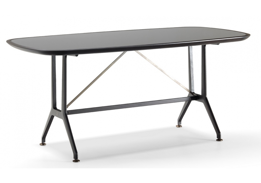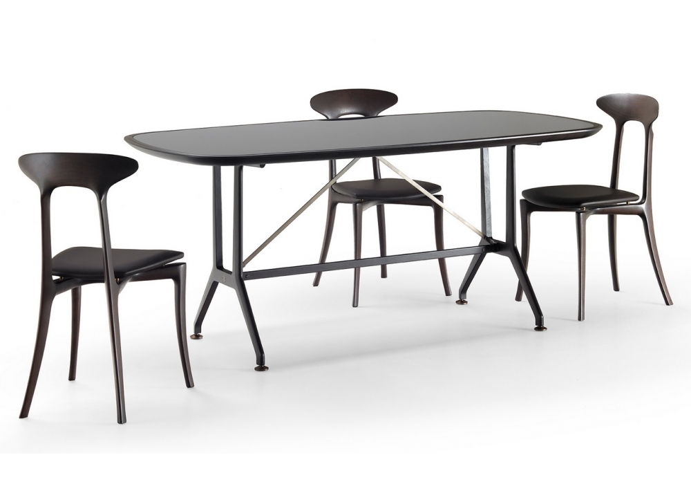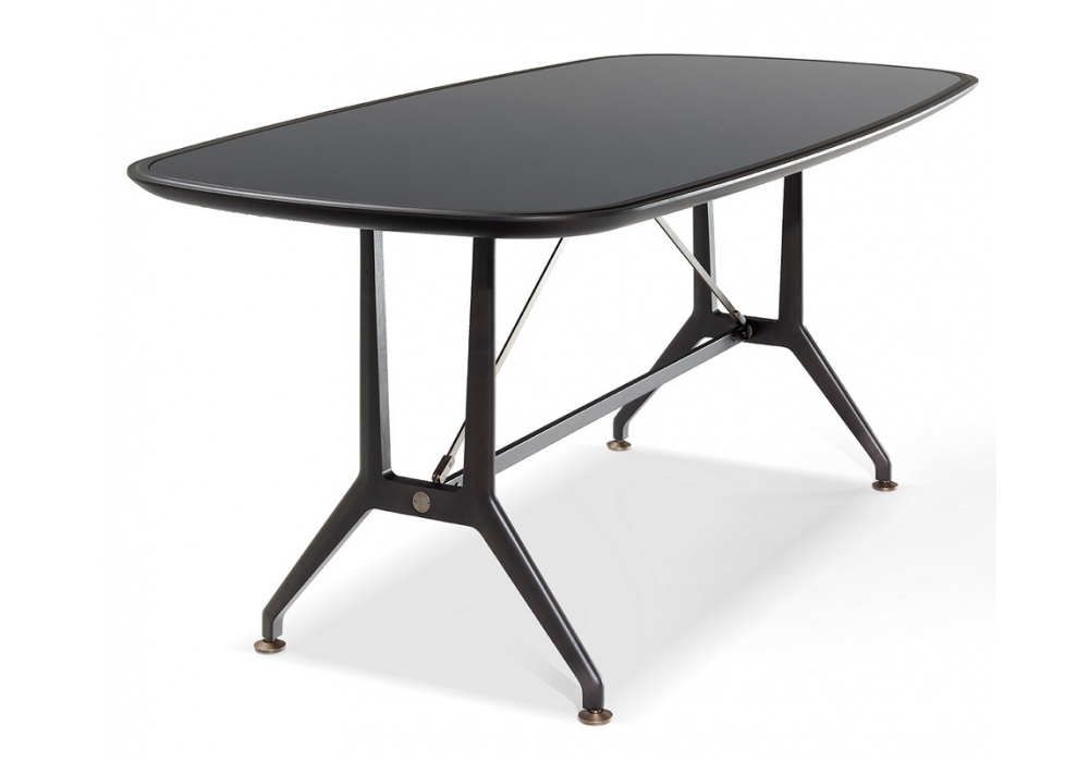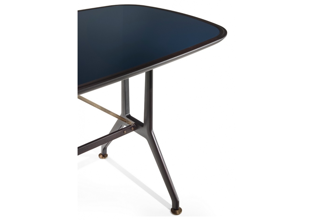 Sopwith 185 conçue par Giuseppe Casarosa pour Ceccotti Collezioni est une table avec structure en noyer américain massif. Tirants en laiton bronzé brossé. Plateau en contreplaqué, placage noyer américain, cuir ou verre coloré. Disponible en différentes finitions et tailles.