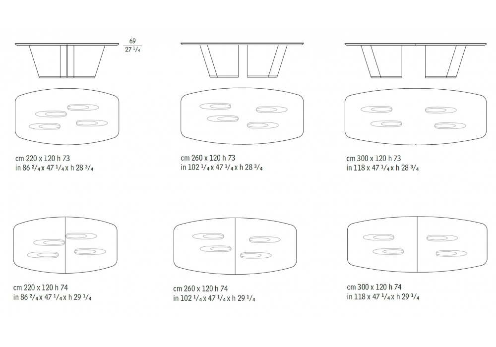 | Dimensions | • 220 x 120 x H 73/74 cm; • 260 x 120 x H 73/74 cm; • 300 x 120 x H 73/74 cm |