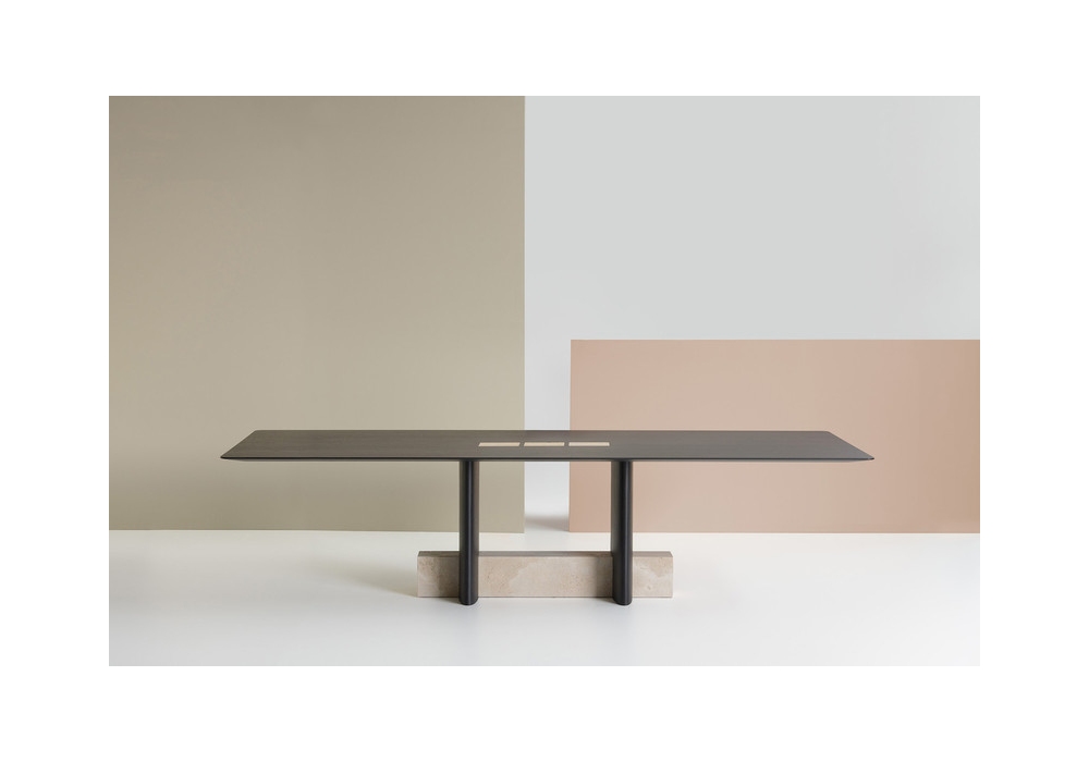 Syn Quadrangular conçue par Mario Ferrarini pour Potocco est une table avec une base structurée par la combinaison du bois et du marbre ou de la pierre. Le plateau est en marbre, pierre ou bois de forme quadrangulaire. Syn est disponible en différentes finitions et tailles.