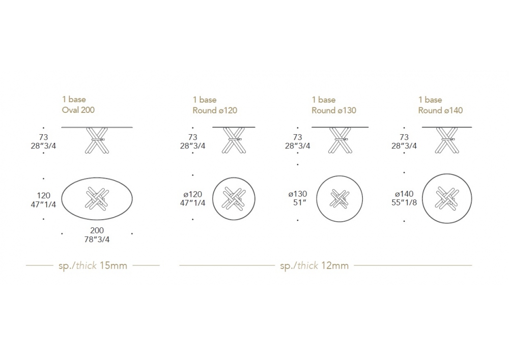 | Dimensions | Ø 120 x H 73 cm; Ø 130 x H 73 cm; Ø 140 x H 73 cm; 200 x 120 x H 73 cm. |