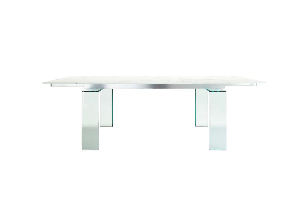 Dardo 72 conçue par Reflex Angelo est une table extensible réalisée avec structure en aluminium et pieds en verre extra-clair ou en verre peint. Plateau et extensions en Marmoreflex/Legnoreflex. Disponible en différentes finitions et dimensions.