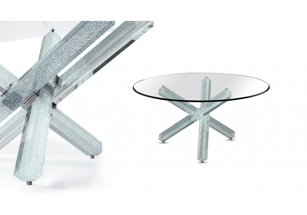 Transeo 72 Craquelè conçue par Tulczinsky pour Reflex Angelo est une table à manger avec base à 3 ou 4 pieds en verre craquelé extra-clair. Plateau en verre transparent.