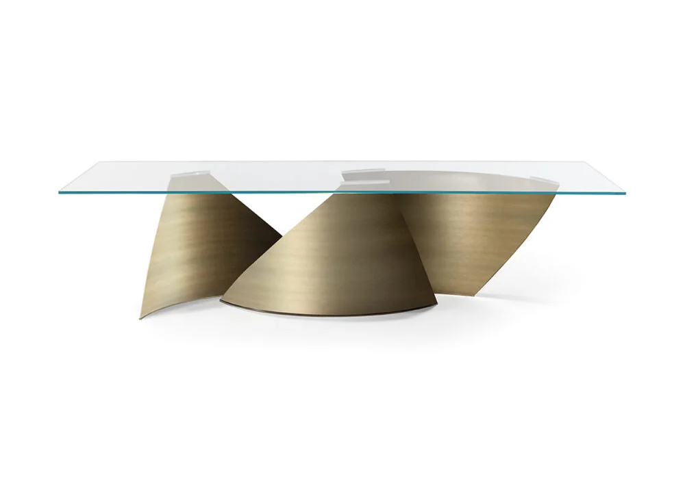 Vele 72 conçue par Reflex Angelo est une table à manger avec des bases en métal courbé en finition satinée : laiton, laiton foncé, titane. Plateau en verre avec bord poli.