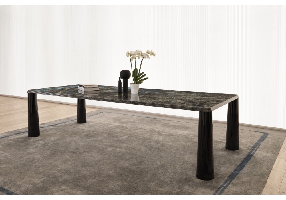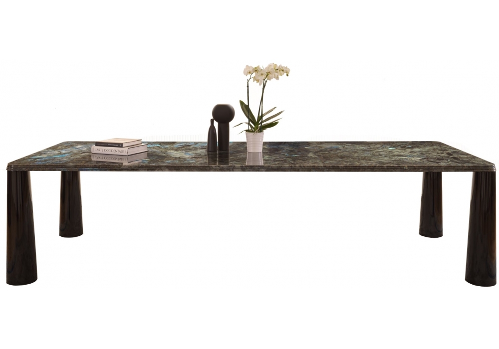 Wellen, conçue par Toan Nguyen pour Karl Lagerfeld Maison, est une table dont le plateau est en marbre Labradorite bleu lémurien et dont les pieds sont réalisés en Black Liquid. Disponible en deux dimensions.
