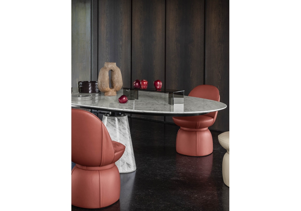 Mesa Ellipse conçue par Lella & Massimo Vignelli pour Poltrona Frau est une table disponible en plusieurs tailles et finitions. Son plateau est en marbre poli ou semi-poli, traité pour résister aux liquides et garantir une plus grande durabilité. La partie inférieure du plateau est renforcée par une maille technique pour une plus grande résistance. La structure portante est en acier peint, composée d'un élément tubulaire et d'un cadre métallique fermé par une feuille d'aluminium peint noir mat. Le piètement de la colonne centrale est disponible en différents matériaux : marbre (assorti à la finition du plateau), cuir Saddle Extra ou cuir Pelle Frau® ColorSphere® (avec coutures ton sur ton).