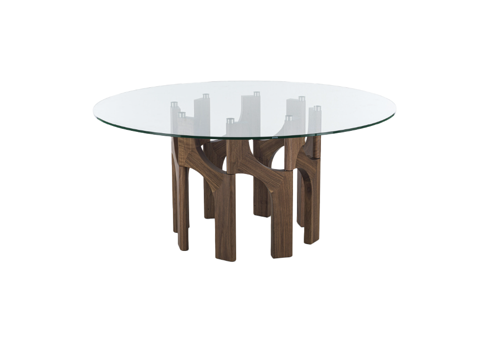 Augusto conçue par D. Dolcini pour Porada est une table avec une base modulaire en noyer canaletta massif et un plateau en verre transparent.