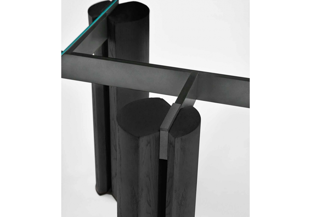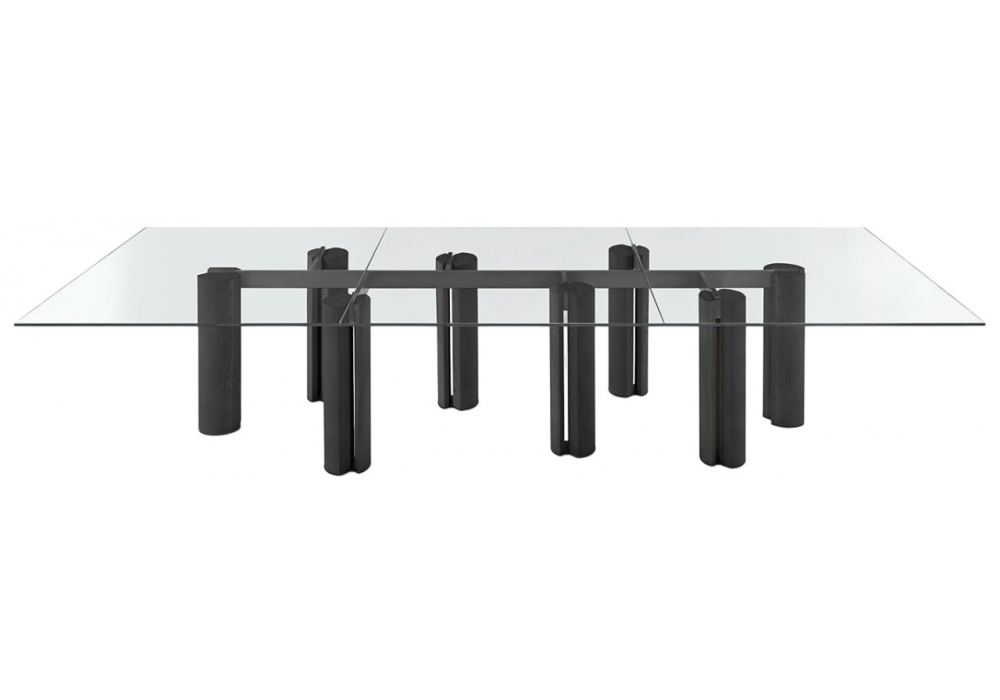 Simpòdio System W conçue par Pinuccio Borgonovo pour Gallotti&Radice est une table avec plateau trempé de 12mm d’épaisseur, disponible en extralight, “grigio Italia” fumé ou verni avec finition exclusive bronze ancien et plomb. Bases en frêne massif à pores ouverts teinté noir. Parties métalliques en métal laqué couleur “gunmetal”.