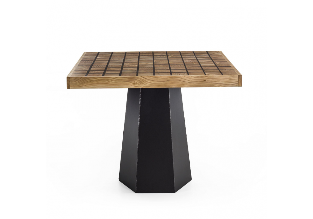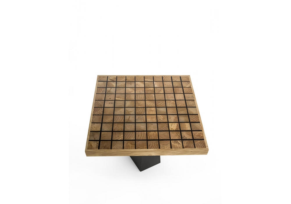 Scacchiera conçue par Authentic Design pour Riva 1920 est une table carrée avec un plateau composé de blocs de cèdre massif récupéré assemblés avec de la résine noire et une base en fer.