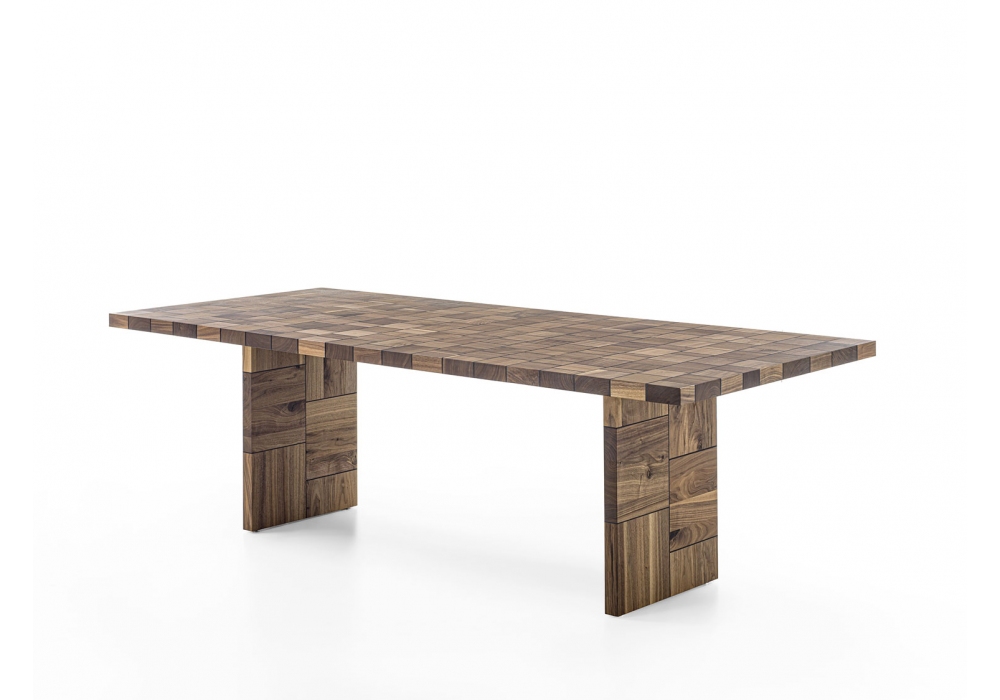 Tableau conçue par Authentic Design pour Riva 1920 est une table avec plateau et pieds faits de blocs de bois de récupération massif et assemblés avec de la résine noire. Disponible en différentes dimensions et finitions.