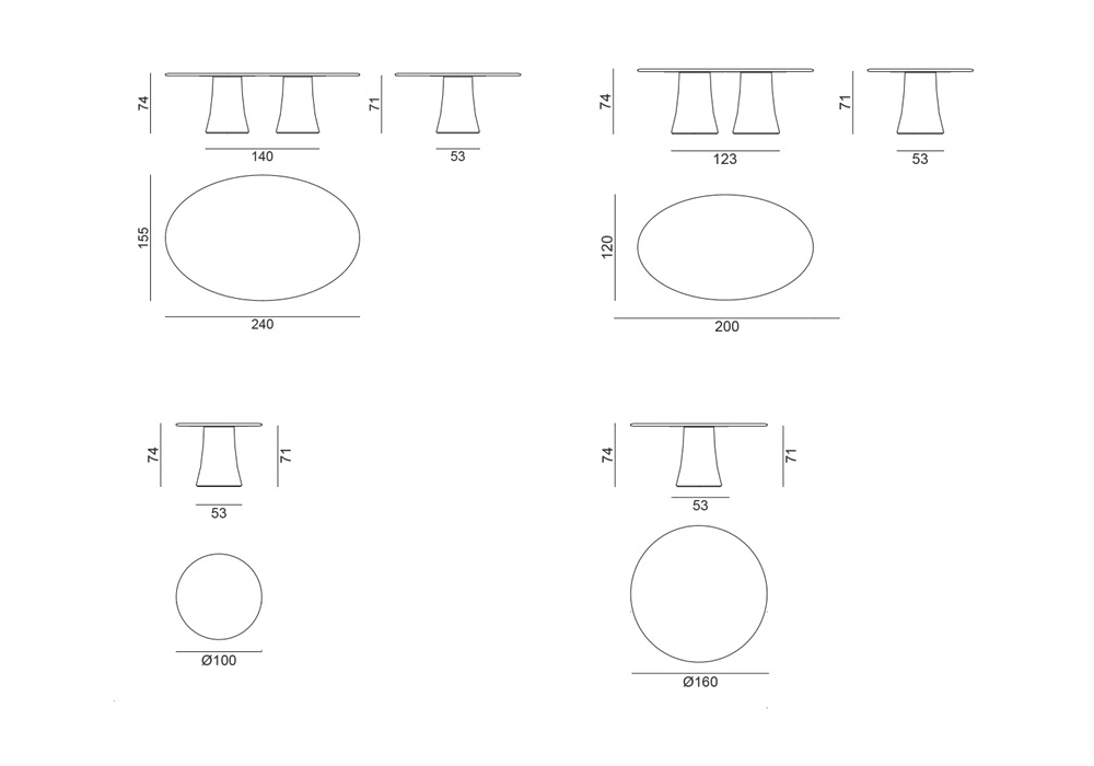 | Dimensions | 240 x 155 x H 74 cm; 200 x 120 x H 74 cm; Ø 160 x H 74 cm; Ø 100 x H 74 cm. |