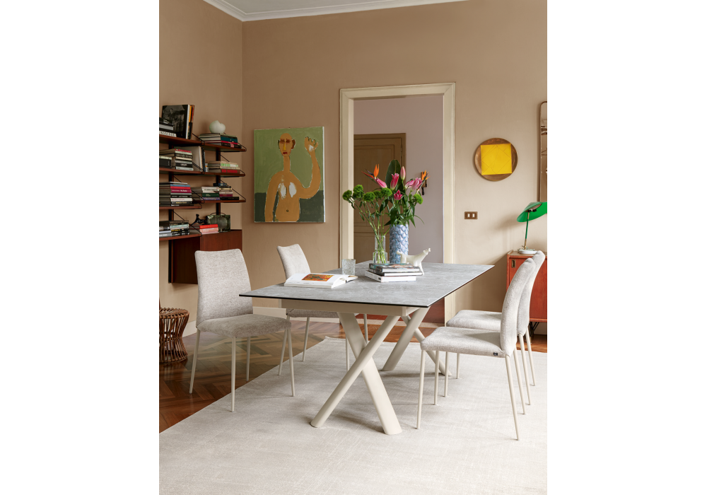 Master conçue par Connubia est une table avec une structure en métal et un plateau en céramique, extensible avec un mécanisme d'ouverture en caisson. Elle est disponible en différentes finitions et dimensions.