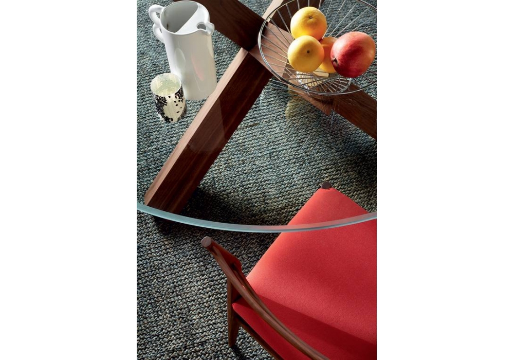 452 La Rotonda conçue par Mario Bellini pour Cassina est une table ronde avec plateau en float anthracite ou verre fumé et base en bois. Disponible en différentes finitions.