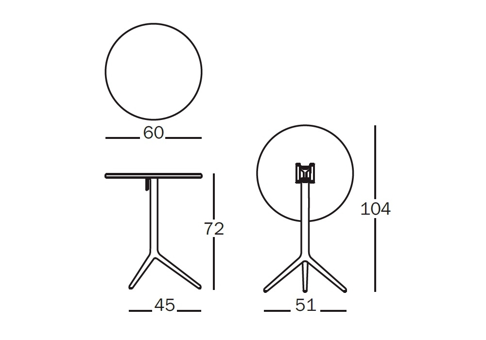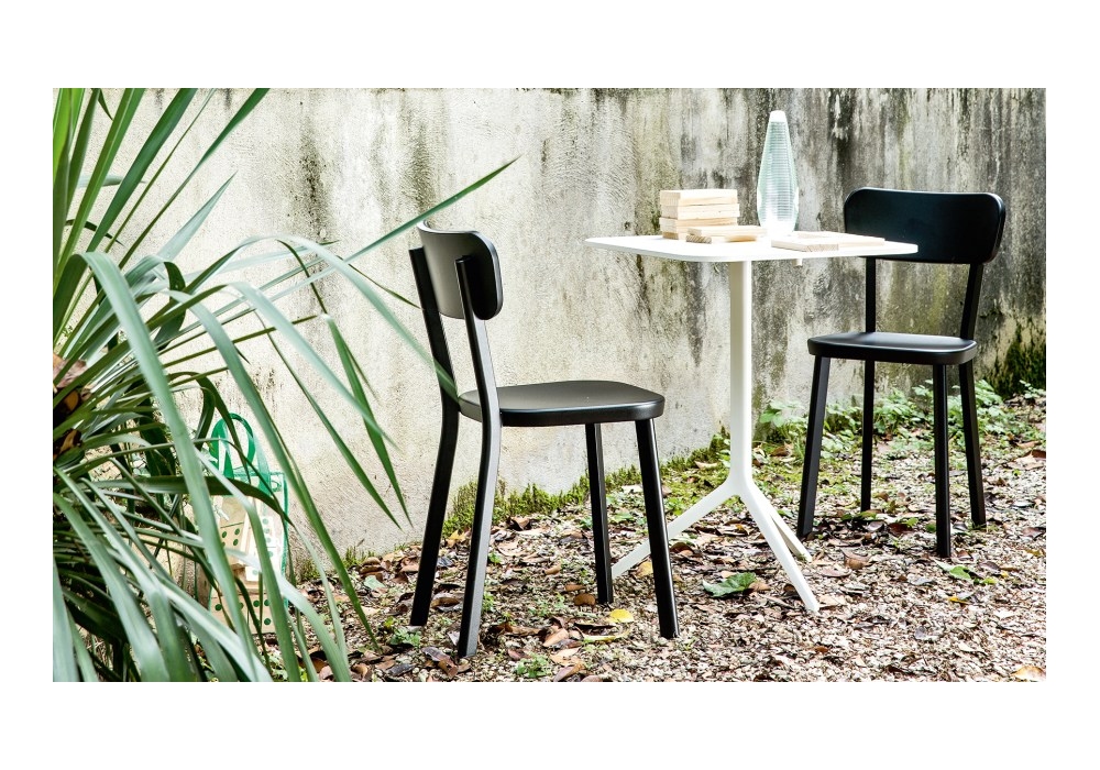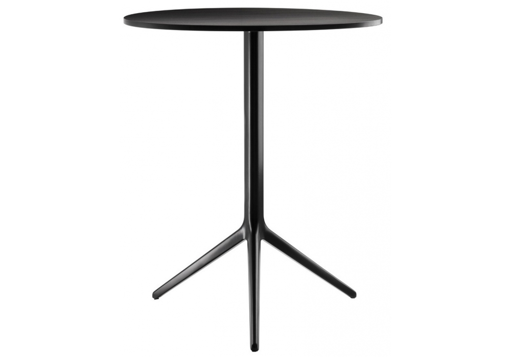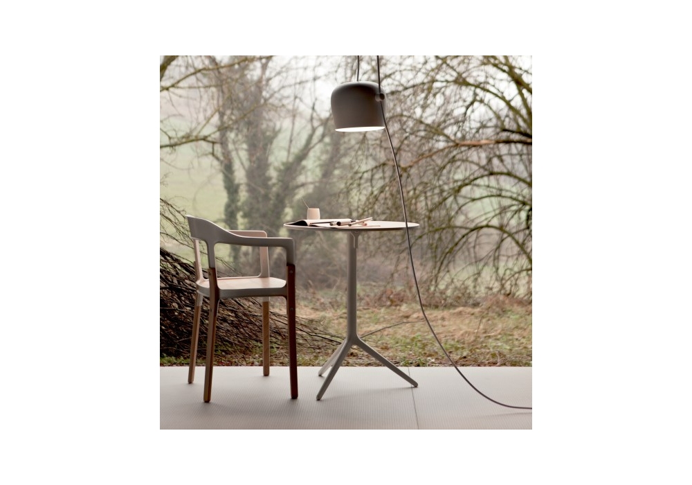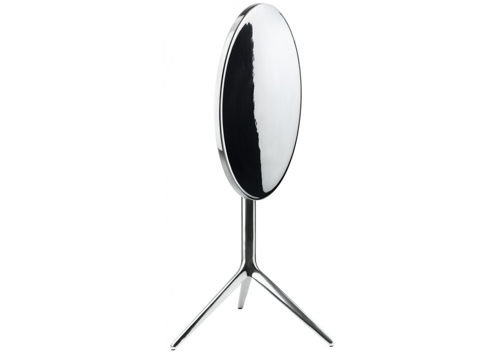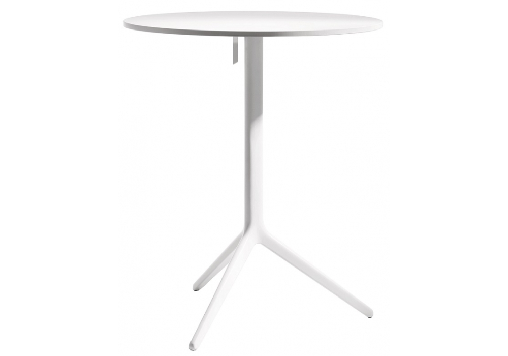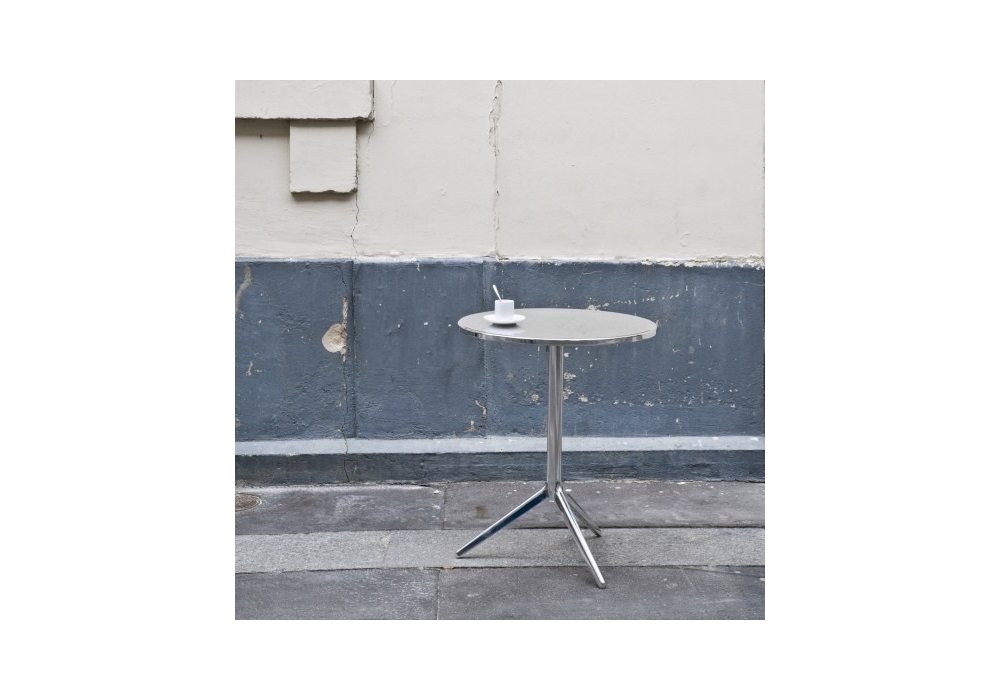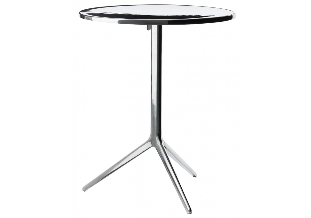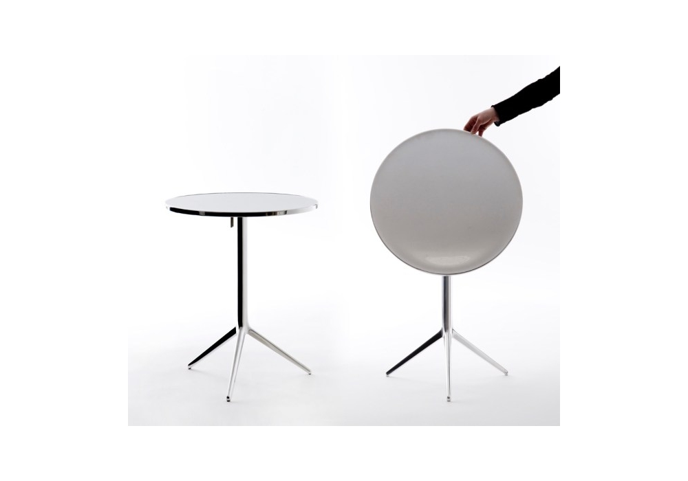 Central conçue par Ronan & Erwan Bouroullec pour Magis est une table avec plateau rond rabattable, structure en aluminium poli ou peint et plateau en aluminium poli ou HPL.