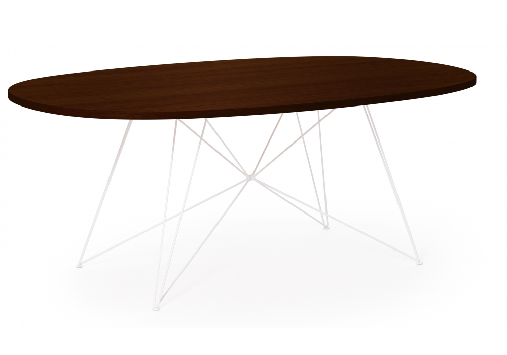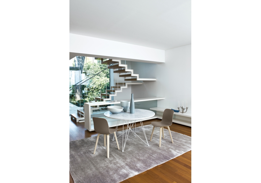 XZ3 conçue par Magis est une table avec structure en tige d'acier chromé ou peint en résine époxy, plateau en MDF peint ou placage chêne.