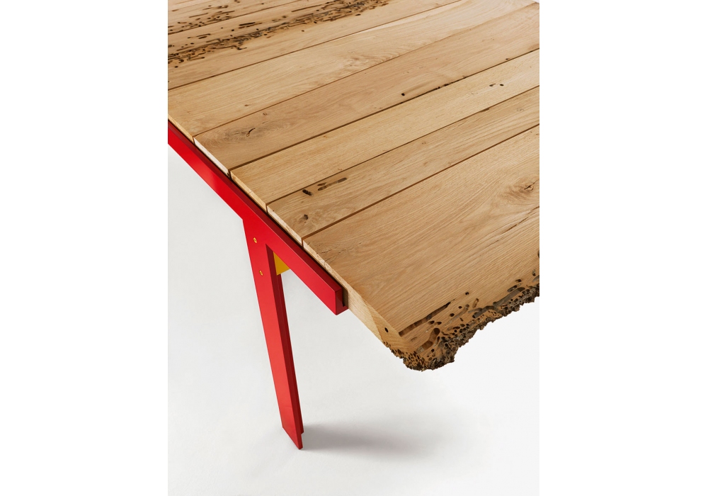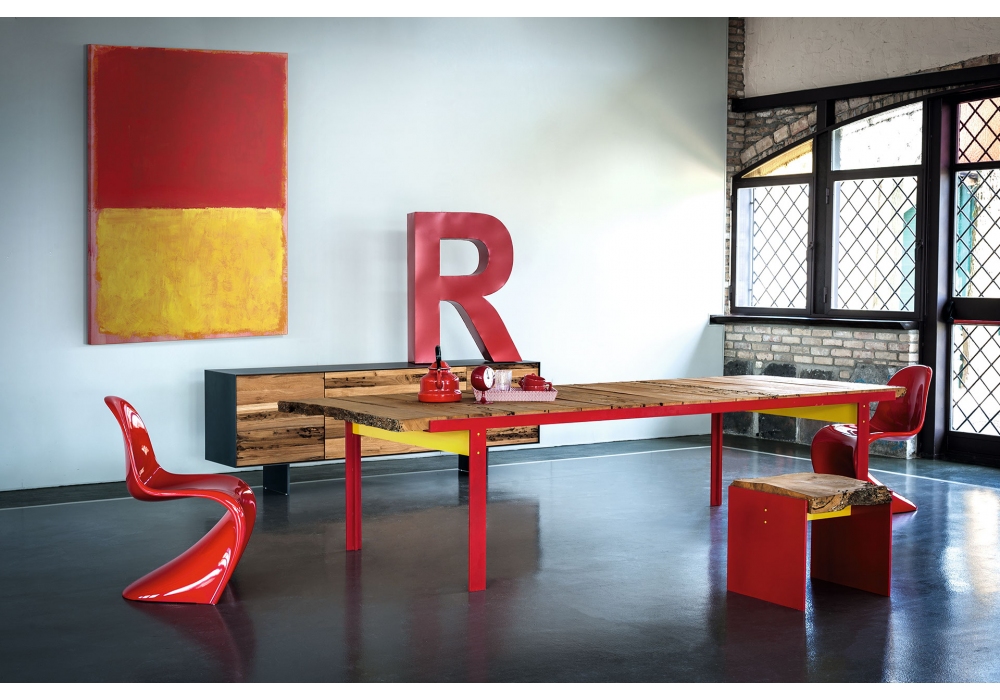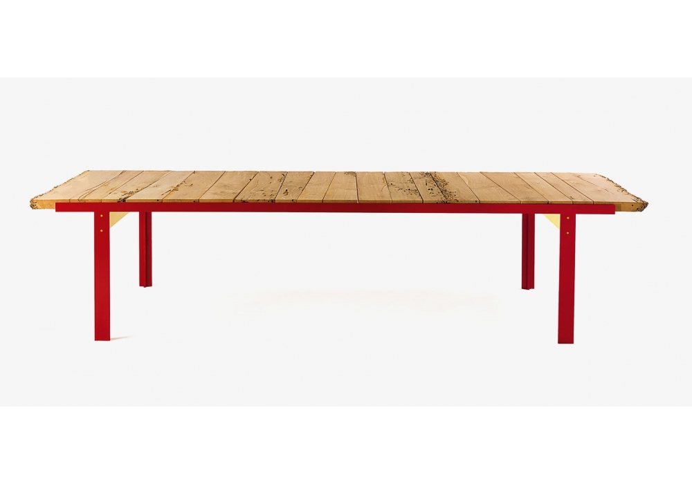 Touch conçue par Carlo Colombo pour Riva 1920 est une table avec plateau en bois massif de Briccola, avec des lattes côte à côte positionnées transversalement avec des têtes à bord naturel. Base en fer laqué composée de quatre pieds en T. Disponible en différentes finitions et dimensions.