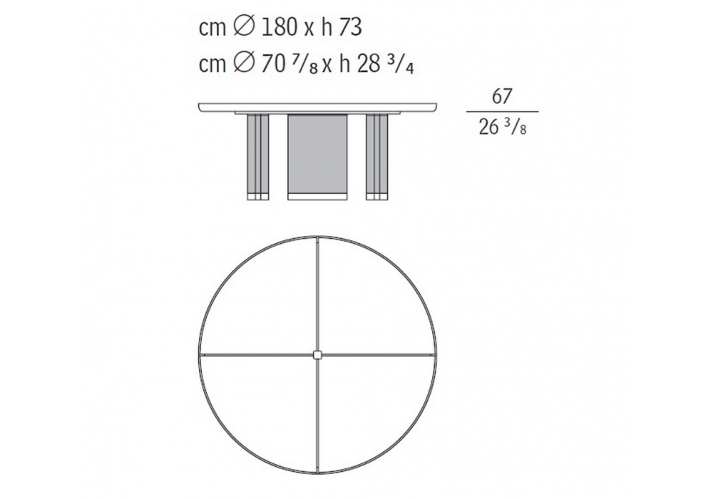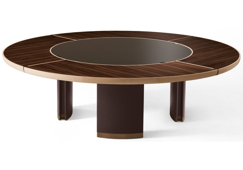 Gordon is a round table designed by Roberto Lazzeroni for Giorgetti. Table with the structure and the dividers of the top in solid maple. The top is in poplar plywood with inserts available in indian rosewood, Rain Forest Brown marble and saddle leather. The columns are in mdf covered with saddle leather and the profiles of the bases, as well as the top inserts, are painted in a bronze colour with natural effect. The 250 cm round version has a lazy Susan insert in glacé crystal glass.