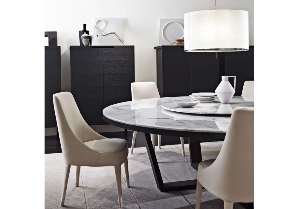 Xilos conçue par Antonio Citterio pour Maxalto est une table ronde disponible en trois dimensions. Structure en chêne gris, chêne clair brossé, chêne noir brossé ou wengé naturel. Plateau en bois ou marbre. Plateau pivotant en chêne ou en marbre.
