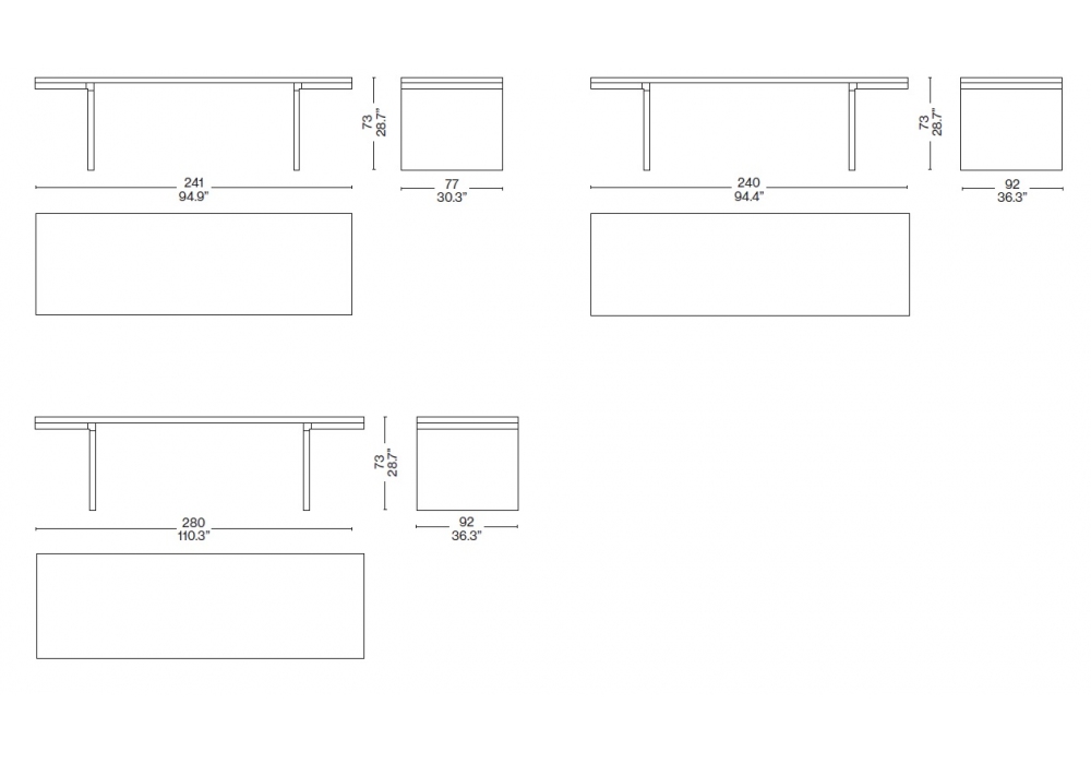 | Dimensions | 241 x 77 H 73 cm; 240 x 92 H 73 cm; 280 x 92 H 73 cm |