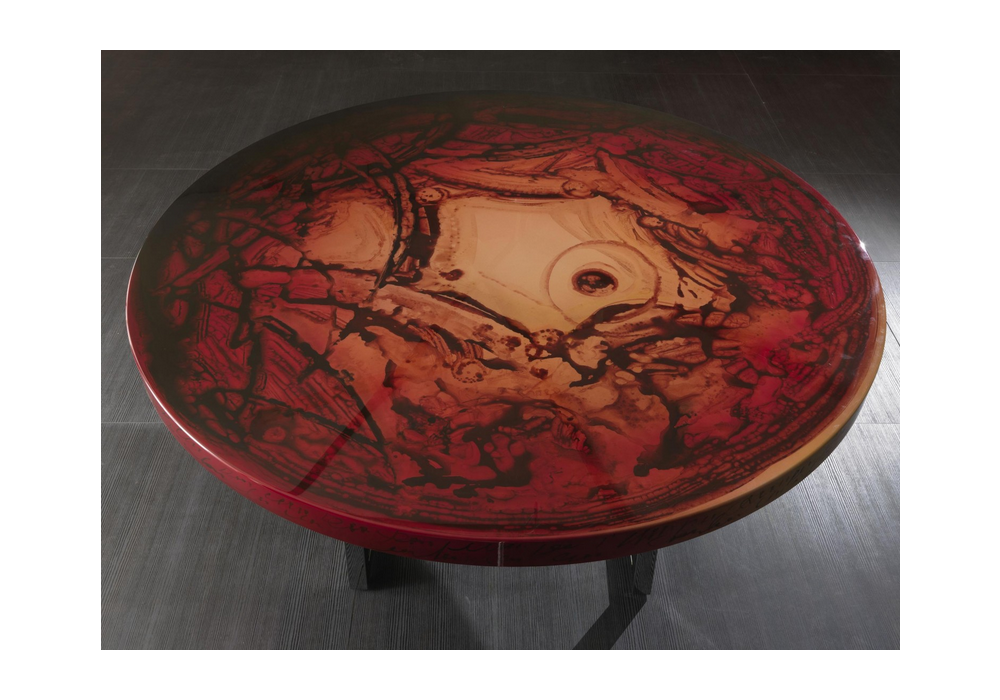Decoro conçue par Rugiano est une table ronde avec plateau de différentes tailles et matériaux avec différentes finitions, elle se caractérise par des détails en laiton bronzé ou chromé.