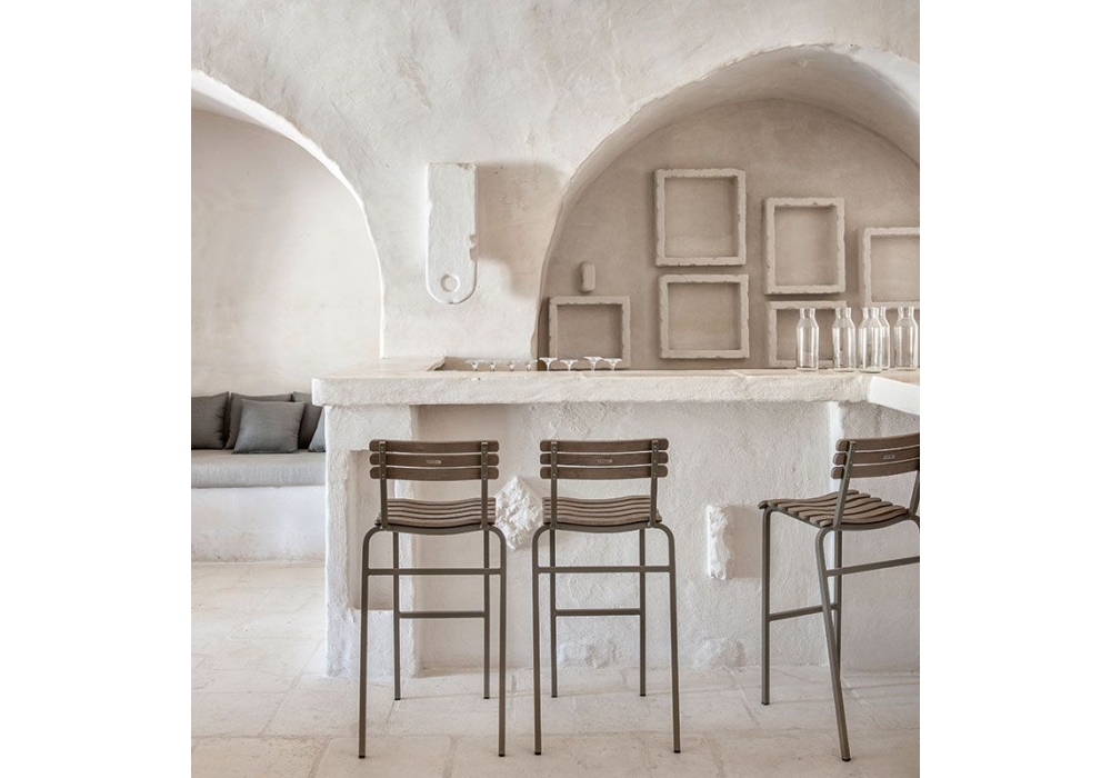 Laren conçu par Ethimo est un tabouret haut pour l'extérieur avec structure en métal et teck en différentes finitions.