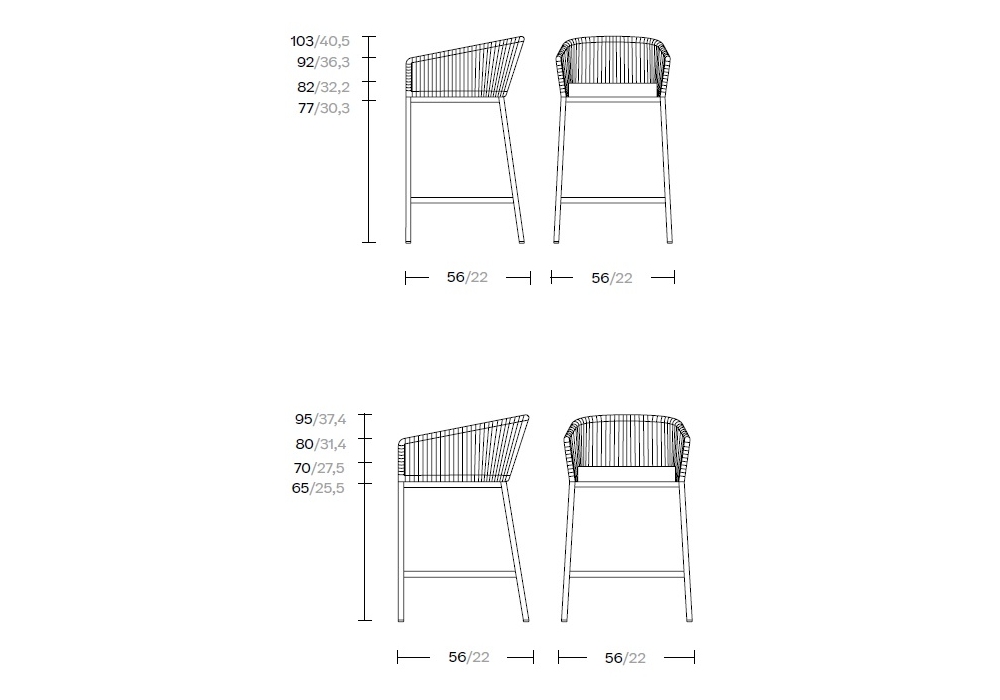 Bitta conçu par Rodolfo Dordoni pour Kettal est un tabouret avec une structure entièrement en aluminium peint. Le dossier est entièrement recouvert de corde synthétique tandis que les coussins d'assise et de dossier sont rembourrés et recouverts de tissu pour une utilisation en extérieur. Bitta est disponible en différentes finitions.