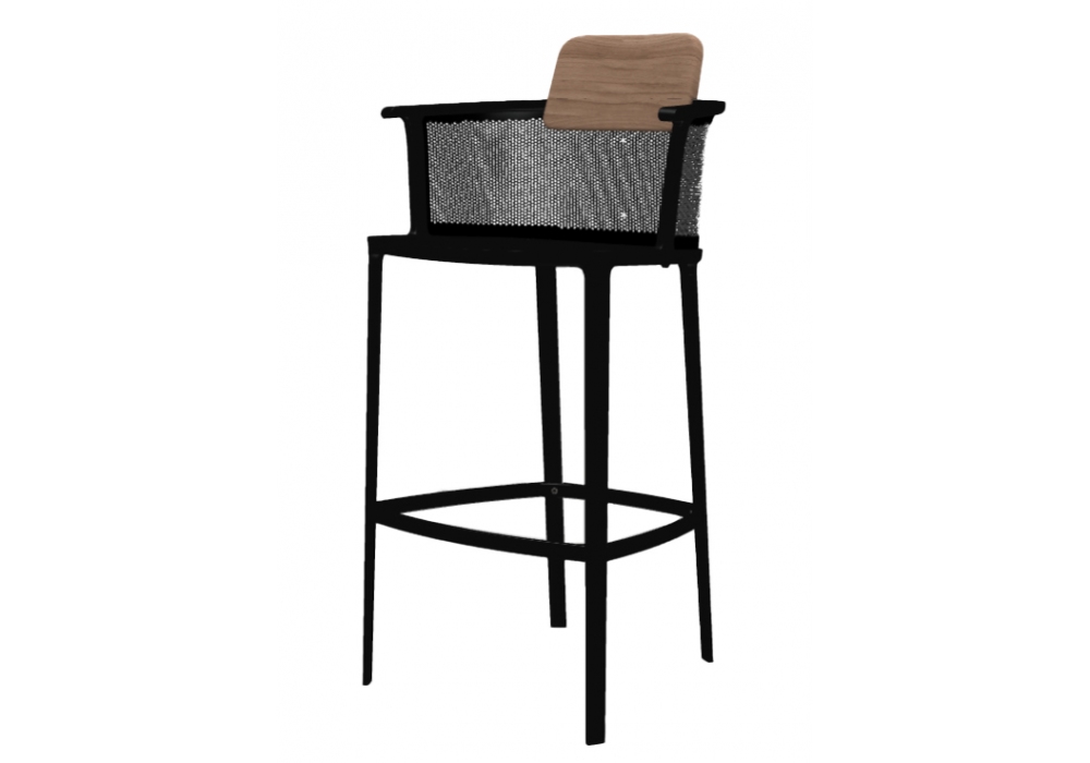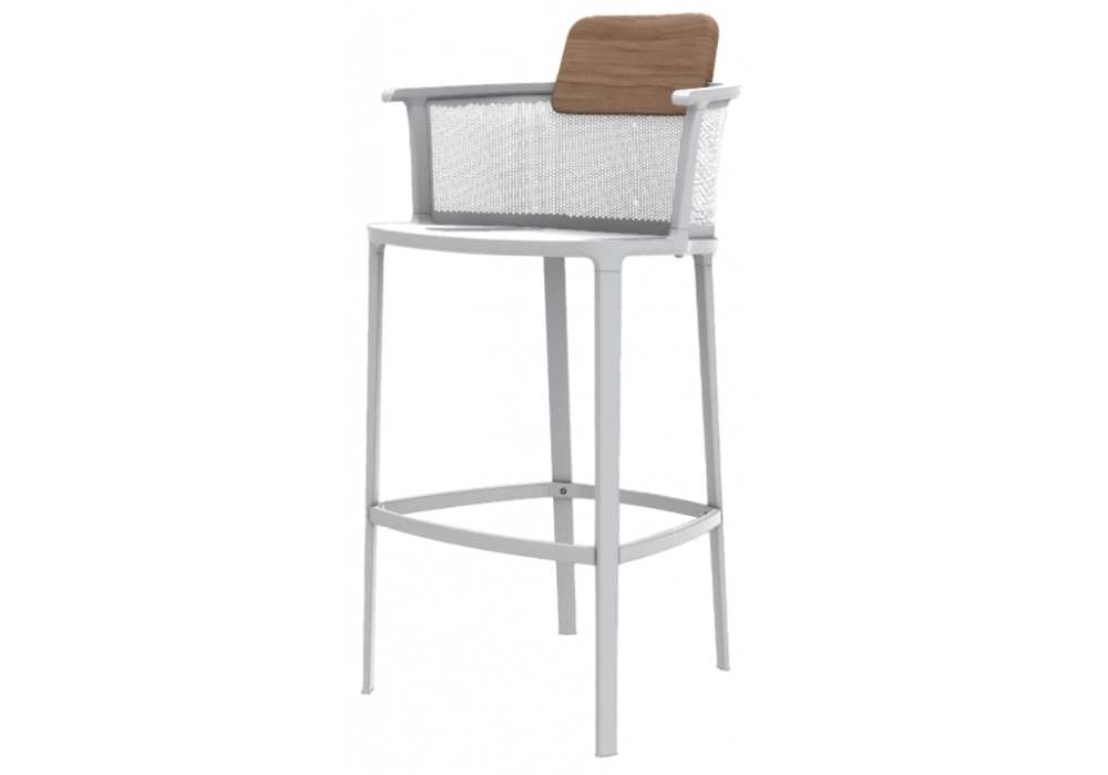 Nicolette conçu par Patrick Norguet pour Ethimo est un tabouret avec structure portante en aluminium peint et bois de teck naturel. Les coussins sont recouverts d'un matériau acrylique hydrofuge disponible en différentes finitions.