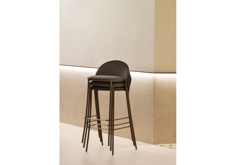 Petale conçu par MUT Design pour Expormim est un tabouret d'extérieur avec structure en tube d'acier inoxydable et assise et dossier en tissu. Disponible en différentes finitions et deux tailles.