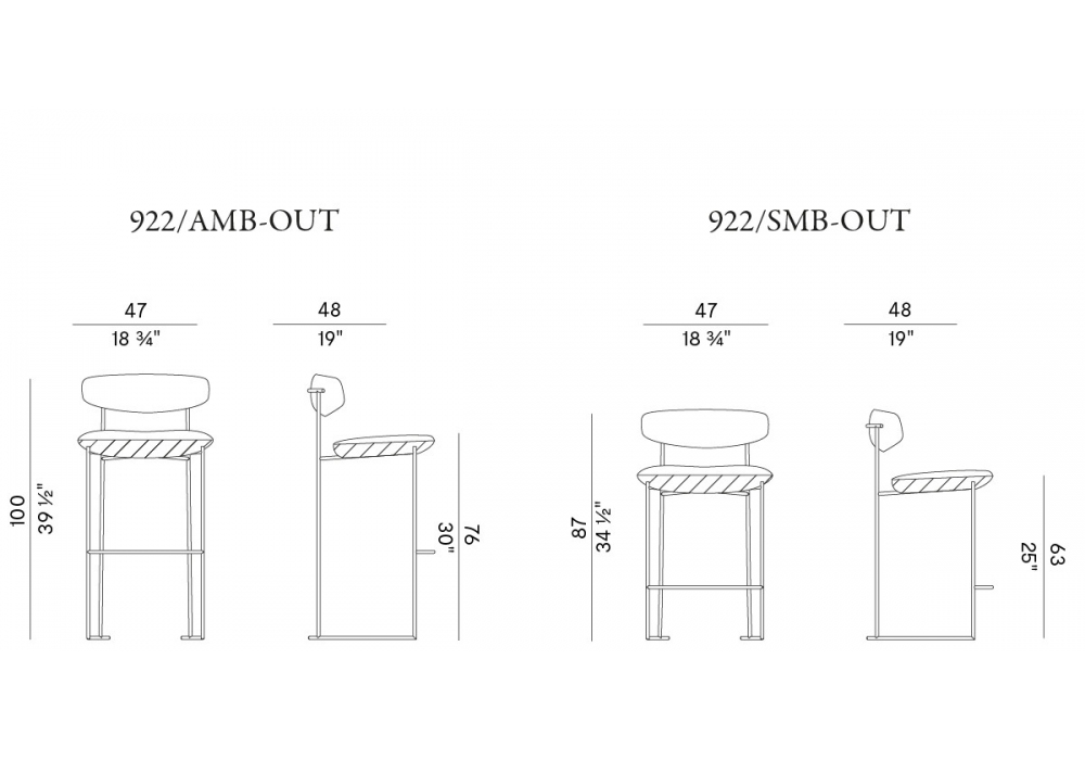 Keel Light Outdoor conçu par M + V pour Potocco est un tabouret d'extérieur avec structure en tige de métal peint en relief, dossier en Iroko massif et assise rembourrée en mousse de polyuréthane ignifuge recouverte de divers tissus avec coque rigide sous-jacente peinte en acrylique, de la même couleur et fin gaufrage du canon..