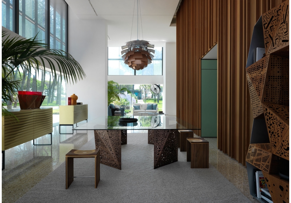 Ripples conçu par Toyo Ito pour Casamania & Horm est un tabouret réalisé avec un contreplaqué spécial et exclusif de cinq types de bois différents (noyer Canaletto, acajou, cerisier, chêne et frêne). Repose-pieds en aluminium anodisé extrudé.