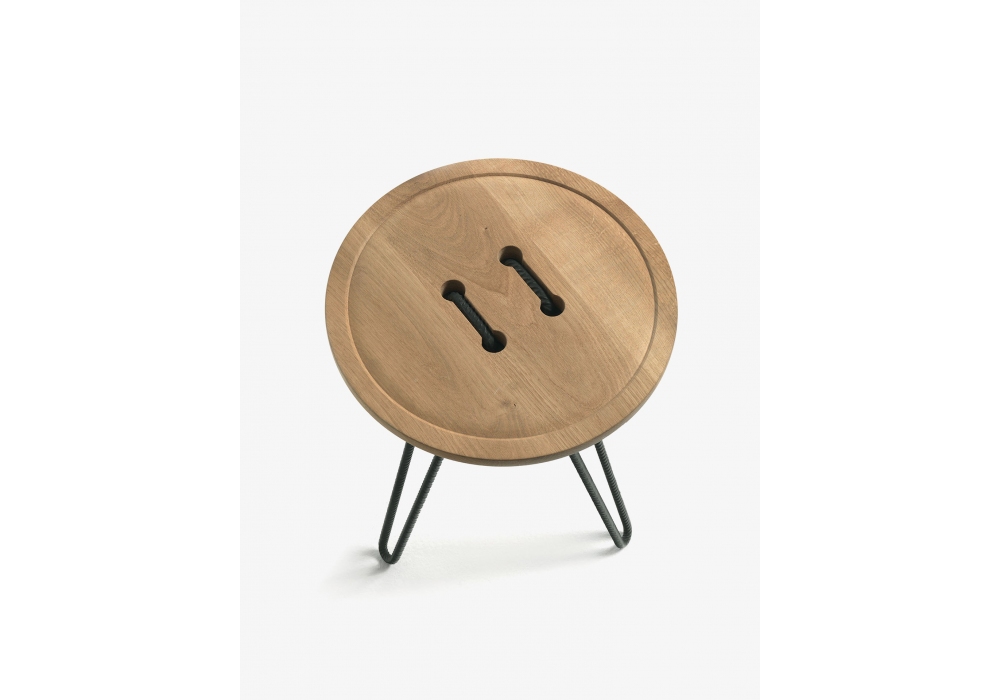 Button Stool conçu par Luca Martorano & Mattia Albicini pour Riva 1920 est un tabouret / table d'appoint réalisé avec un plateau en bois massif, c'est un bouton géant inséré par de gros fils de fer torsadés.