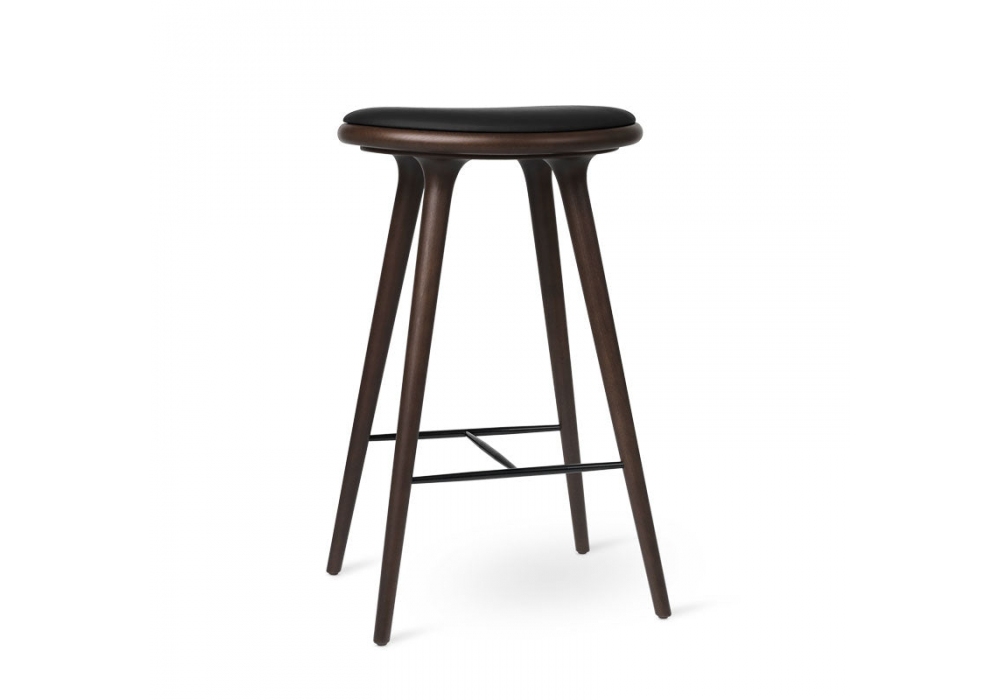 High Tabouret conçu par Space Copenhagen pour Mater est un tabouret en bois de hêtre ou de chêne, disponible en différentes finitions et tailles. Assise en cuir véritable, finition noire.