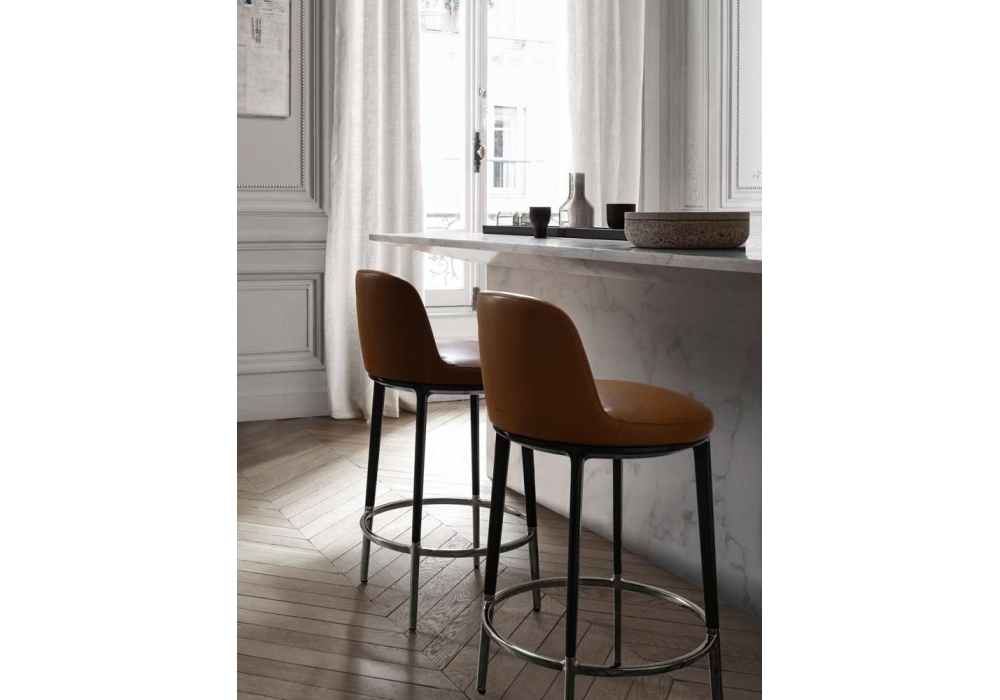 Caratos conçu par Antonio Citterio pour Maxalto est un tabouret pivotant avec une structure de support en métal bicolore, une partie inférieure en aluminium sablé poli et une partie supérieure en différentes finitions. Revêtement en tissu ou cuir.