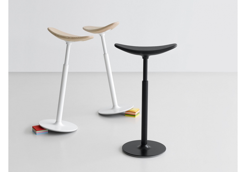 Ryo conçu par Enzo Berti pour Lapalma est un tabouret pivotant réglable en hauteur. Base et colonne en métal entièrement thermolaquées en blanc ou noir. Assise en frêne massif naturel ou noir à pores ouverts. Levier de commande intégré sous le siège. Également disponible avec une base non pivotante.