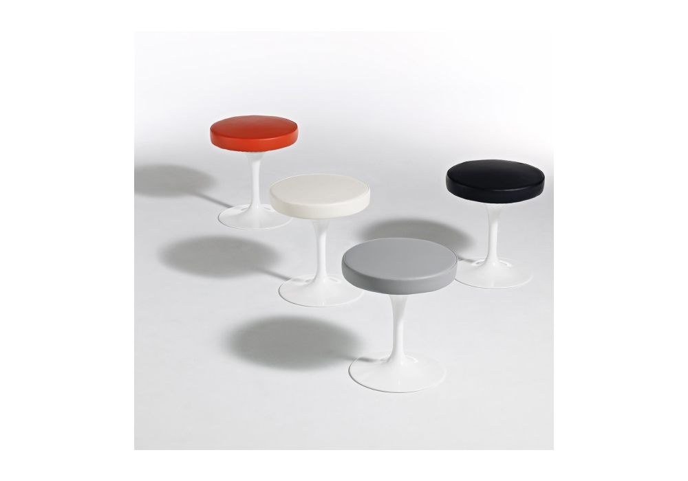 Tulip conçu par Eero Saarinen pour Knoll est un tabouret avec une base en aluminium traité et protégé au Rilsan en finition blanche ou noire. Revêtement en tissu ou cuir.