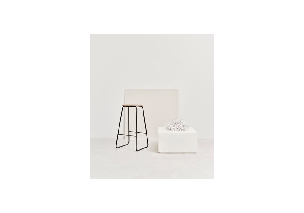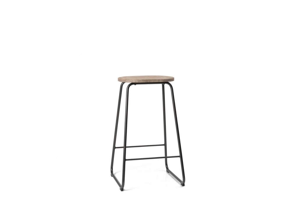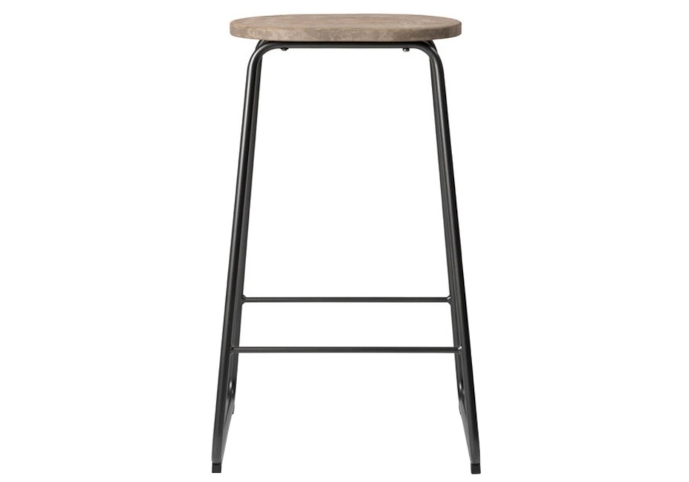 Earth conçu par Eva Harlou pour Mater est un tabouret avec structure en acier bronze et assise en bois de chêne certifié FSC, plastique ABS Novo Nordisk ou déchets de coquille de café et déchets de plastique recyclé provenant des productions de bière Carlsberg mélangés à du plastique recyclé.