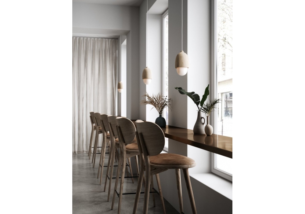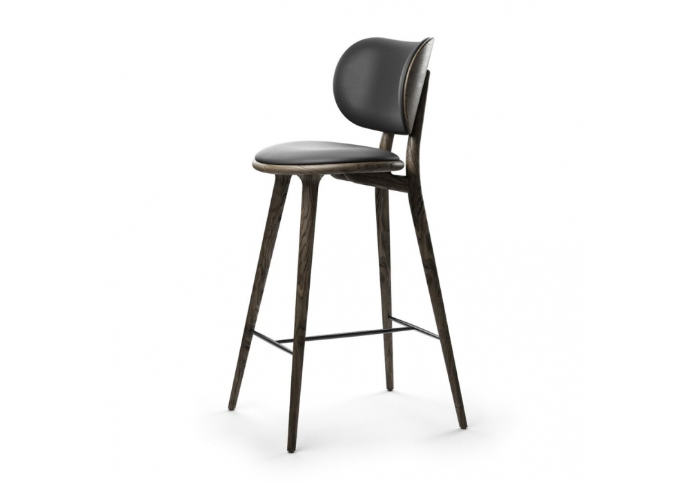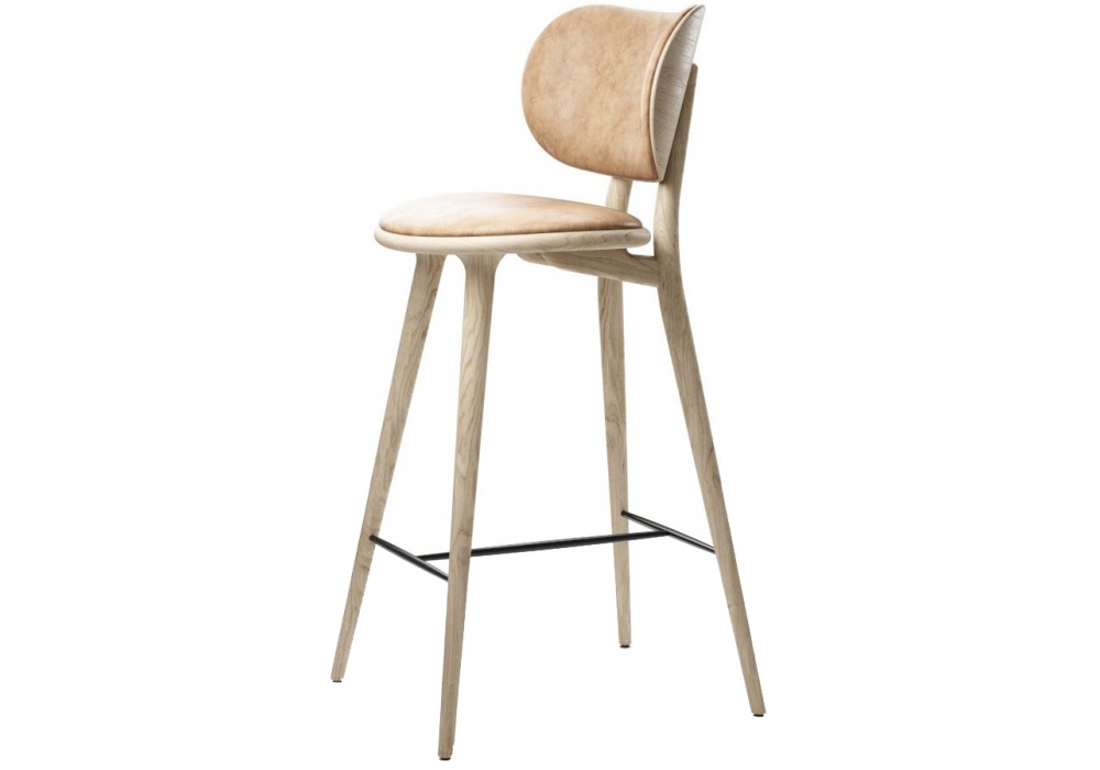 High Stool Backrest conçu par Space Copenhagen pour Mater est un tabouret en chêne massif certifié FSC ou en hêtre certifié FSC et assise rembourrée en cuir. Il est disponible en différentes tailles et finitions.