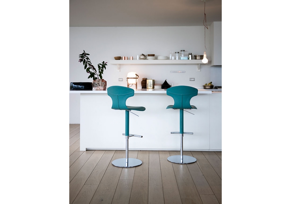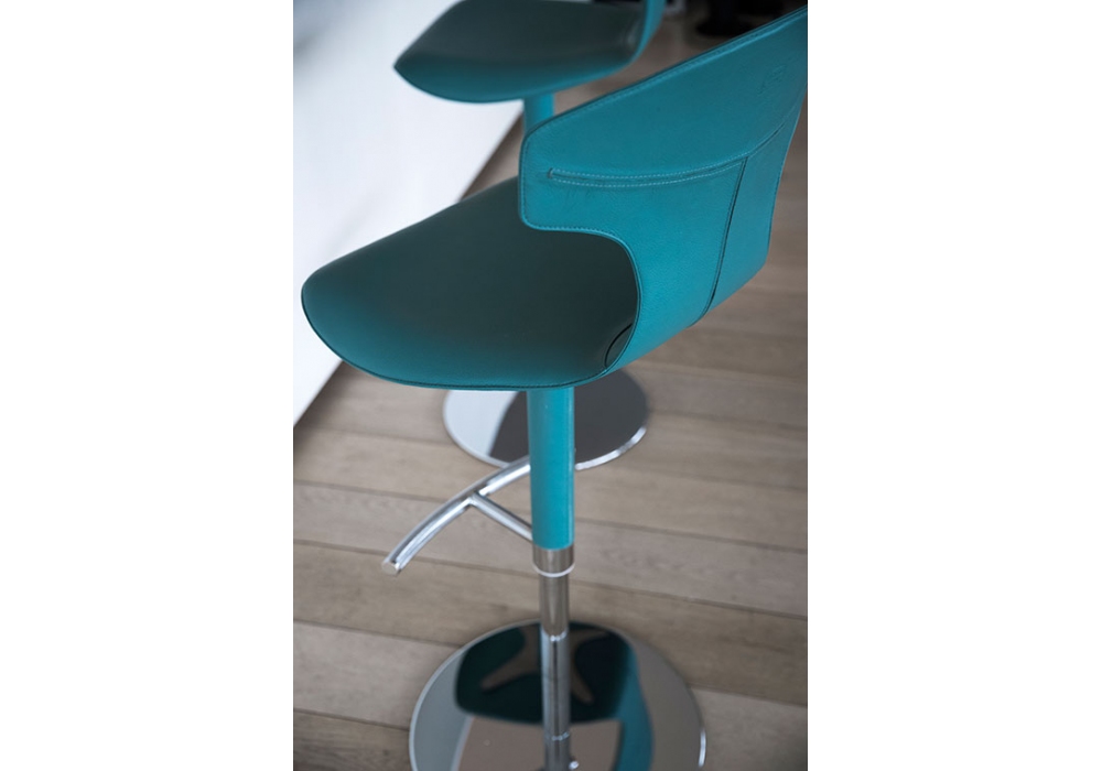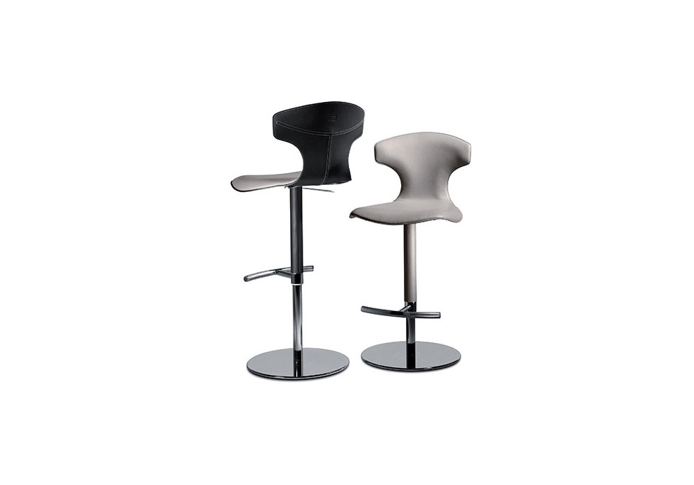 Montera conçu par Roberto Lazzeroni pour Poltrona Frau est un tabouret avec coque en contreplaqué de hêtre plié moulé rembourré de mousse de polyuréthane et recouvert de cuir de selle à l'extérieur et de cuir à l'intérieur. La base est en acier chromé, elle est composée d'une structure de plaque d'articulation à quatre supports, d'une colonne, d'un repose-pieds tubulaire et d'une base plate ronde. La partie supérieure de la colonne (au-dessus du repose-pieds) est recouverte de cuir de selle assorti à la garniture de coque.