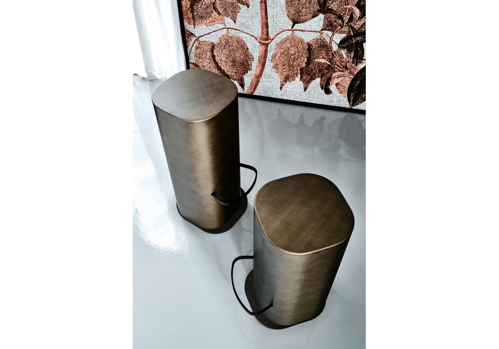 Pancho conçu par Paolo Cattelan pour Cattelan Italia est un tabouret disponible en deux tailles. Structure en acier Brushed Bronze ou Brushed Grey et repose-pieds en acier laqué gaufré noir.