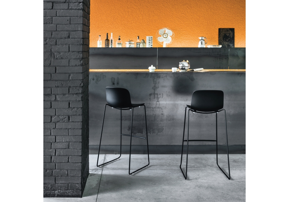 Troy Sledge Polypropylene conçu par Marcel Wanders pour Magis est un tabouret empilable avec structure en acier chromé ou peint et assise en polypropylène. Disponible en différentes finitions et deux tailles.