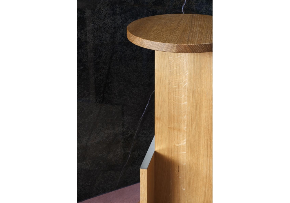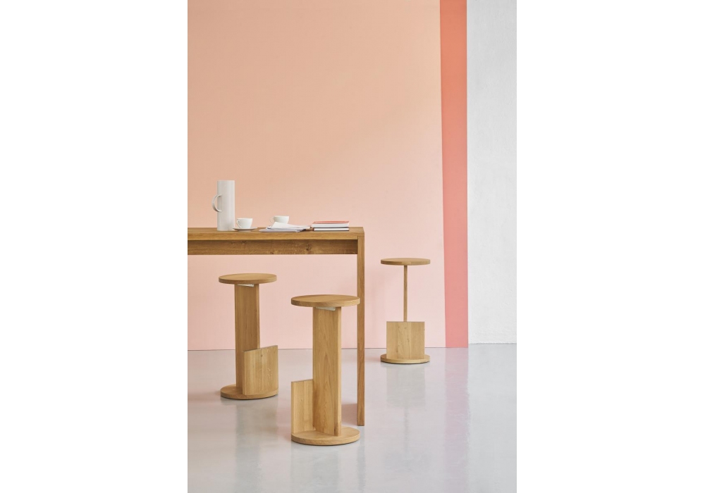 DT01 Tank conçu par David Thulstrup pour E15 est un tabouret avec structure en bois de chêne massif adapté aux intérieurs privés et publics. Disponible en deux hauteurs.
