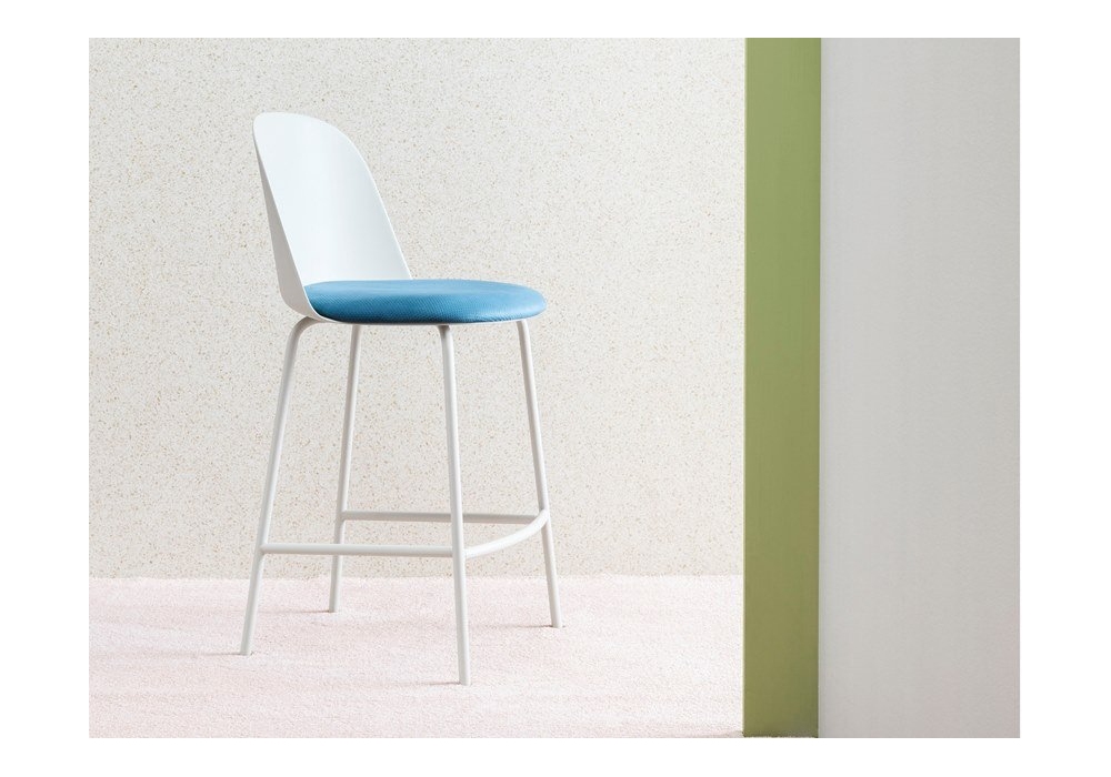 Mariolina conçu par E-ggs pour Miniforms est un tabouret avec base en métal peint, coque en polypropylène dans la même finition que la base, assise avec revêtement en tissu. Disponible en différentes finitions.