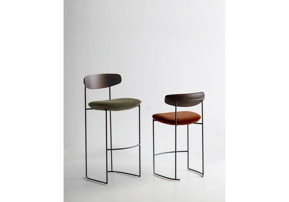 Keel conçu par M + V pour Potocco est un tabouret avec structure en tige de métal peint gaufré, dossier en frêne massif et assise rembourrée en mousse de polyuréthane ignifuge avec revêtement en divers tissus, cuirs ou éco-cuirs.