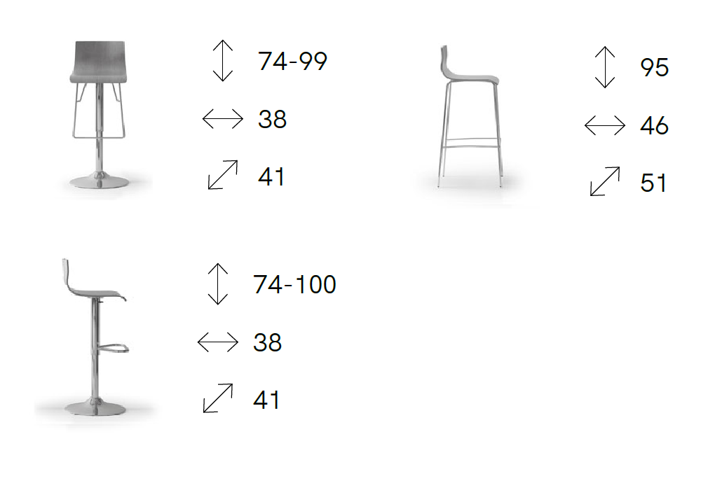 | Dimensions | 38 x 41 x H 75-100 cm; 38 x 41 x H 74-100 cm; 46 x 51 x H 96 cm. |