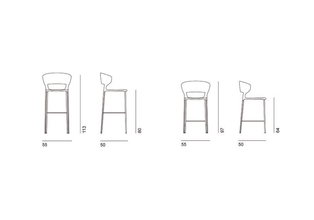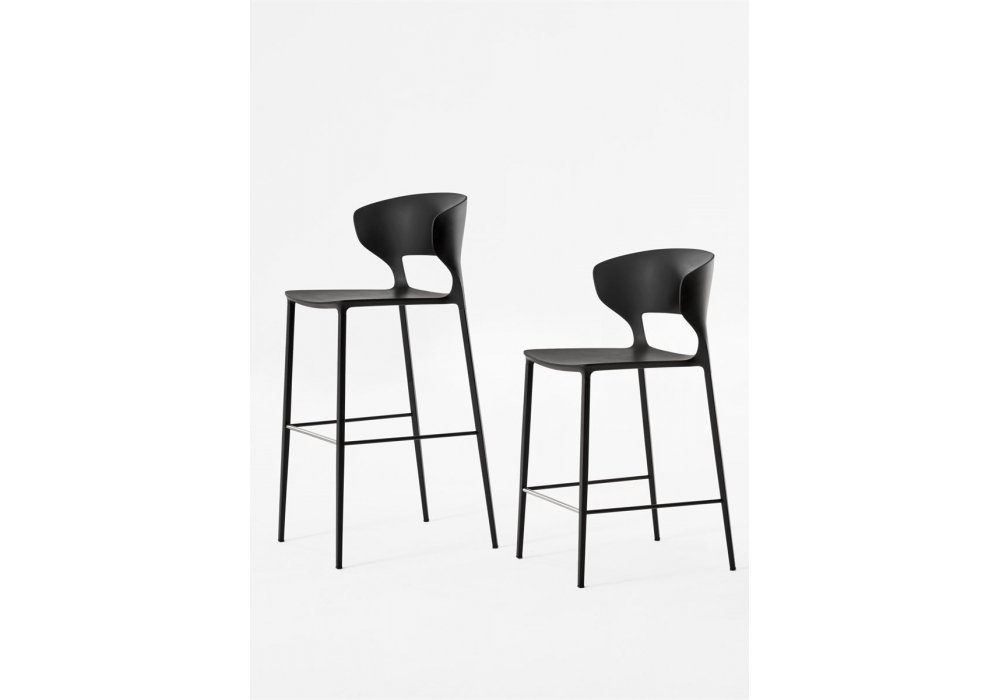 Koki 708 conçu par Pocci e Dondoli pour Desalto est un tabouret avec assise en polyuréthane peint, structure interne et pieds en acier, repose-pieds en tube d'acier recouvert d'un profilé en acier inoxydable. Disponible en différentes finitions et tailles.