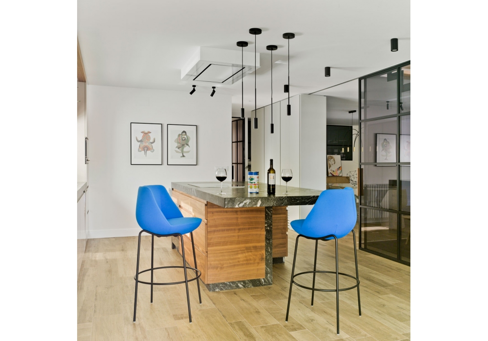 Magnum conçu par EstudiHac pour Sancal est un tabouret avec pieds en acier finition dorée ou laqué mat en différentes couleurs, assise et dossier rembourrés recouverts de tissu.