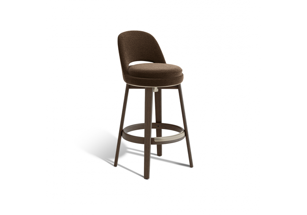 Mollis conçu par Vincent Van Duysen pour Molteni&C est un tabouret doté d'un piètement en bois massif teinté et d'une structure sous-assise en acier peint, avec une assise pivotante à 360° à retour automatique. Le repose-pieds est en aluminium peint. L'assise et le dossier sont constitués d'une armature en Polimex et d'un rembourrage en mousse de polyuréthane à densité variable. Le coussin est en polyuréthane moulé et recouvert de fibre de polyester.
