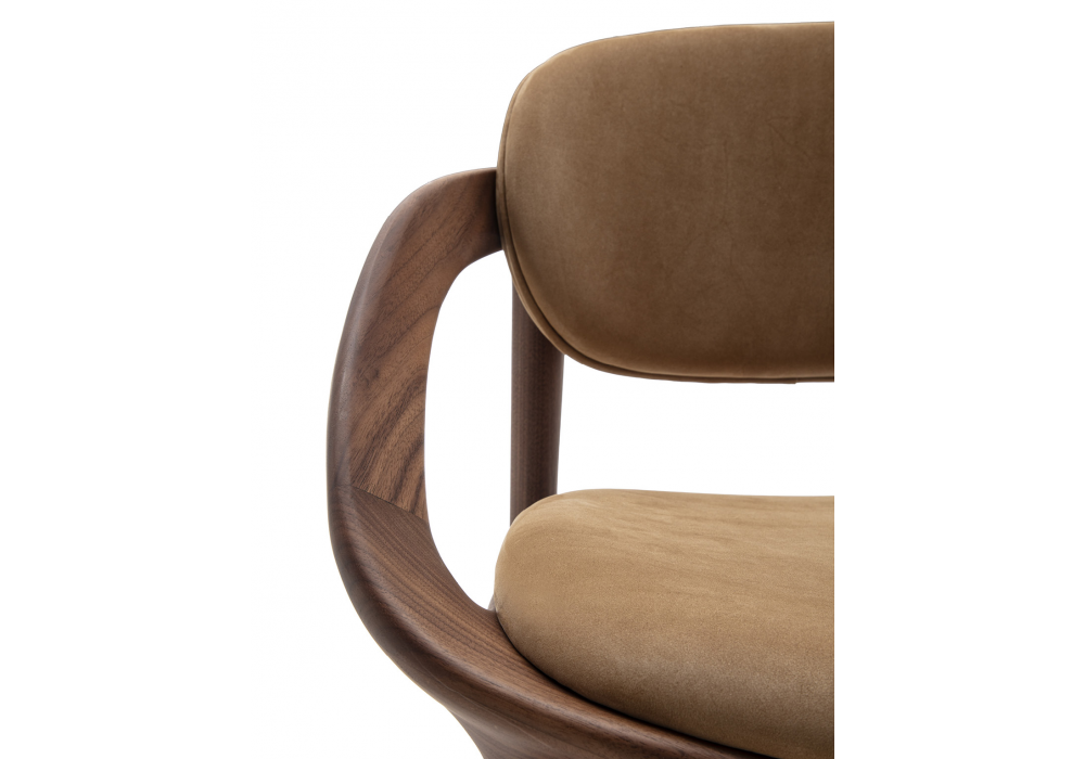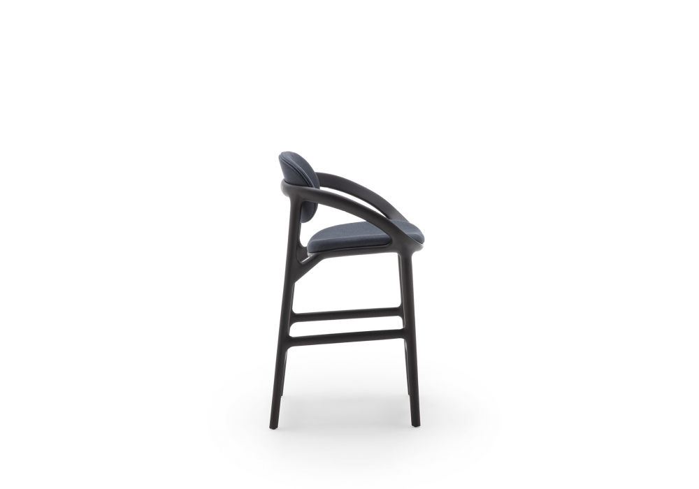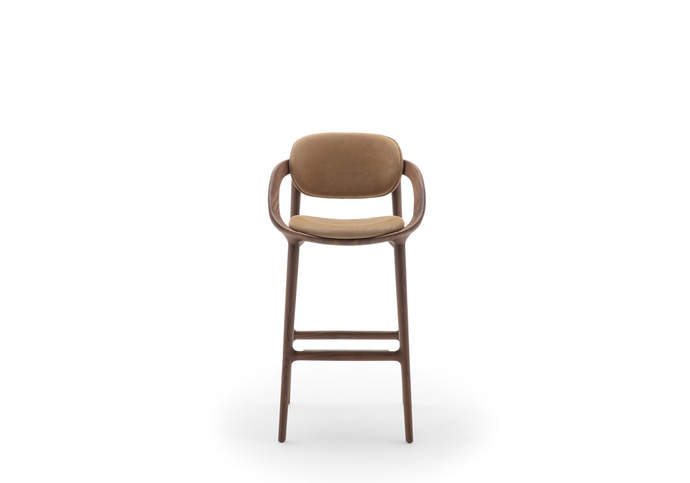 Molly conçu par Meneghello Paolelli pour Porada est un tabouret doté d'une structure en noyer Canaletta massif ou en chêne, ainsi que d'un coussin d'assise et de dossier recouvert de tissu ou de cuir. La traverse avant du repose-pieds est rehaussée d'un détail en acier inoxydable.