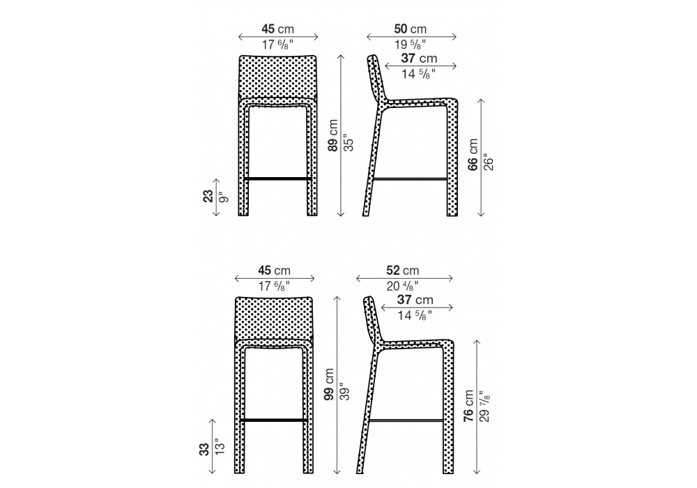 | Dimensions | 45 x 50 x H 89 cm - Hs 66 cm; 45 x 52 x H 99 cm - Hs 76 cm. |