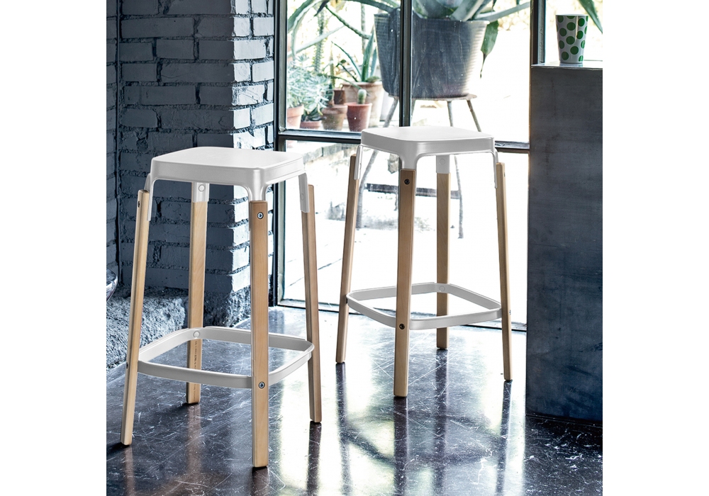 Steelwood conçu par Ronan & Erwan Bouroullec pour Magis est un tabouret réalisé avec des pieds en hêtre massif naturel, noyer ou peint. Assise et repose-pieds en tôle d'acier peint polyester. Disponible en différentes finitions.