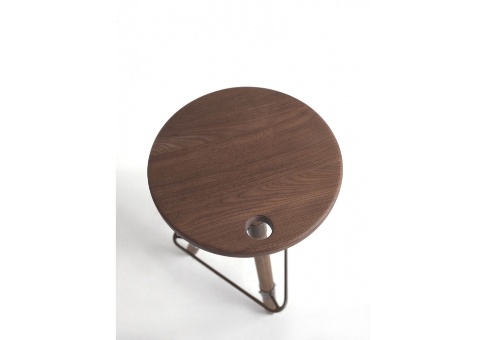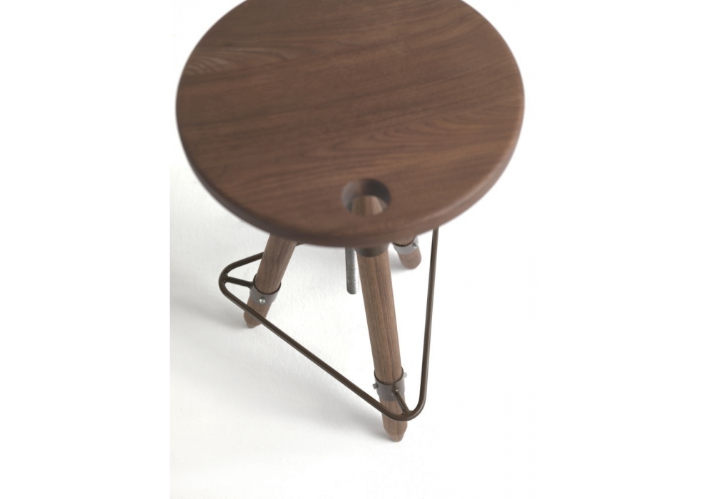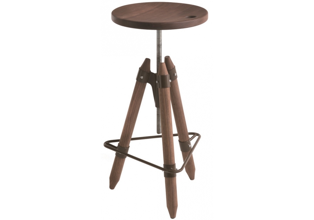 Ello conçu par Franco & Matteo Origoni pour Riva 1920 est un tabouret de bar, équipé d'un repose-pieds en fer, entièrement en bois massif avec une assise pivotante et réglable en hauteur.